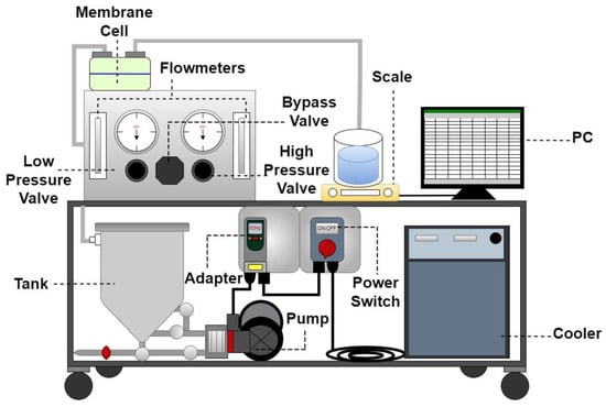 The pretreatment of PSWW was conducted with MF and UF membranes. Both MF and UF membranes were procured from Sterlitech Corporation (Auburn, WA, USA). The MF membrane was made up of polyvinylidene fluoride (PVDF), while the UF membrane was composed of polyether sulfone (PES), as listed in Table 2. The MF and UF membranes were used in a Sterlitech customized membrane system, as illustrated in Figure 2. The membrane filtration system consisted of two flowmeters, a power-on switch, an adapter, a high-pressure valve, a low-pressure valve, a bypass valve, a pump, a tank, and a cooling unit. The membrane cell was made up of Delrin material. The dimensions of the cell were 0.127 m in length, 0.1 m in width, and 0.083 m in height, and the effective membrane area of the cell was 0.0042 m2. The tank was made of stainless steel and could hold up to about 20 L of wastewater. The operating pressure and flow rate of the MF membrane were 413 kPa and 6.0 L/min, respectively. UF was run at the same flow rate as MF; however, the pressure was twice as high as that in MF. The performance of MF and UF was evaluated based on pollutant removal efficiency and average flux.