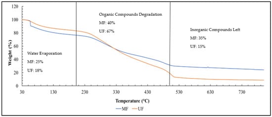 Weight loss analysis at different stages was used to quantify the proportion of organic and inorganic compounds in the MF and UF foulants. As displayed in Figure 3, up to 200 °C, the TGA curve showed a weight loss of around 25% for MF and about 18% for UF. This initial weight loss was caused by the evaporation of water molecules from the foulants, a characteristic seen in both MF and UF foulants. The degradation of organic compounds for MF and UF foulants occurred within the temperature range from 200 °C to 500 °C, accounting for approximately 40% of organics in MF foulants and 67% in UF foulants. The remaining weight percentage represents the quantity of inorganic compounds found in MF and UF, which were 35% and 15%, respectively. The TGA results corroborate the TVSs measurements, indicating that the UF achieved high removal efficiency of TVSs compared to that of MF. Consequently, UF fouling exhibited a higher concentration of organic compounds than MF fouling.