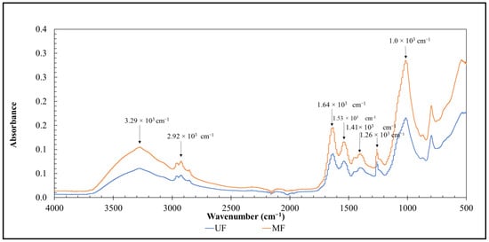 FTIR is a rapid and accurate method for identifying functional groups, providing valuable information about the composition of foulants []. The FTIR analysis revealed that the MF and UF foulants contain very similar organic compounds, as similar bands were identified. For instance, the peak at 1000 cm−1 and 1260 cm−1 is associated with the C-O group in polysaccharides, and 1410 cm−1 represents the C-O group in hydroxy acid lipids, as shown in Figure 4. The 1530 cm−1 and 1640 cm−1 specify an amino group in proteins. The 2920 cm−1 shows the C-H group in fats and 3290 cm−1 exhibits the protein hydroxyl group.