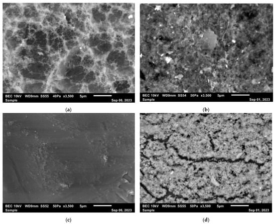 The MF and UF fouled and virgin membranes were analyzed using SEM-EDS. The SEM results showed a significant difference in the morphology between the virgin and fouled membranes in both the MF and UF categories. As illustrated in Figure 5a,c, the MF and UF virgin membranes displayed a smooth surface compared to the MF and UF fouled membranes in Figure 5b,d, in which a ridge structure is apparent. In the fouled membranes, the deposition of particles resulted in the amorphous matrix. This fouling layer introduced additional resistance to the MF and UF membranes, significantly reducing their filtration performance.