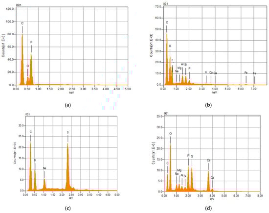 EDS elemental analysis of fouled and virgin membranes. (a) MF virgin membrane; (b) MF fouled membrane; (c) UF virgin membrane; (d) UF fouled membrane.
