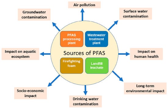 Per- and poly-fluoroalkyl substances (PFAS) are man-made compounds that constitute a vast family of fluorinated substances. These substances started to gain attention in the early 2000s, when the presence and hazardous properties of perfluorooctanoic acid (PFOA) and perfluorooctanesulfonic acid (PFOS) were reported []. The use of these substances dates back to the 1930s–1940s, with a typical example being Teflon, or polytetrafluoroethylene-PTFE, an organic polymer used as a coating for multiple applications, such as cooking utensils or fabrics to make them waterproof [,]. As shown in Figure 1, the main sources of PFAS emissions into the environment are processing plants, fire-fighting foam, landfills, and wastewater treatment facilities, and their effects extend to many environmental compartments.
