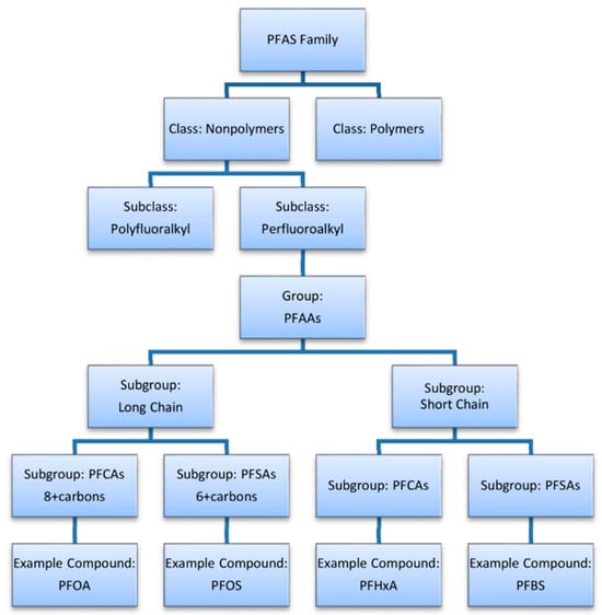The new definition gives an easily implementable approach that takes into account the broadness of the PFAS universe, starting from small molecules to complex aromatics and polymers. Furthermore, the work from the OECD also highlights the need to also consider user-specific working scopes in the definition of chemicals as PFAS, thus combining the general definition with additional considerations []. According to this approach, PFAS can also be further categorized into different classes, as shown in Figure 2 and described in the following paragraphs.