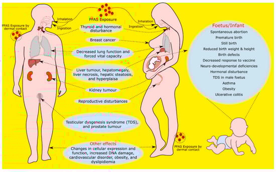 In the case of fetuses and later infants, there is particular concern as prenatal exposure to PFAS appears to affect their development, which can cause further problems. According to Post et al., 2017 [], breastfed infants are more at risk than the elderly (considered a vulnerable group in general), even when their mothers are exposed to low levels. Grandjean et al., 2012 [], through a survey and biomonitoring campaign conducted on 5- and 7-year-old children in the Faroe Islands, found that high concentrations of PFOS, PFOA, PFHxS, PFNA, and PFDA detected in their blood serum resulted in lower responses to childhood vaccinations. Gallo et al., 2012 [], demonstrated the indisputable influence of PFOA and PFOS on the levels of ALT (Alanine Transaminase), i.e., an indicator of hepatocellular damage, as well as the increase in total cholesterol, low-density lipoproteins (LDL), and high-density lipoproteins (HDL). Additionally, Zeeshan et al., 2020 [], highlighted the enhanced risk of vitreous disruption due to exposure to long-chain PFAS.