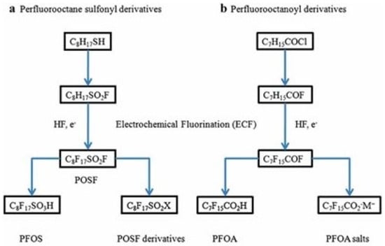 Electrochemical fluorination is a process in which an organic raw material is dissolved in hydrogen fluoride (HF), seeking to counteract the hydrogen atoms with fluorine. Linear and branched chains are produced, the proportion of which depends on the process control, but it usually ranges from 70 to 80% for linear and 20 to 30% for branched, respectively. For example, the electrochemical fluorination of C8H17SO2F that is shown in Figure 4 yields (1) perfluorooctane sulfonyl fluoride (POSF, C8F17SO2F), a primary feedstock used to make PFOS; (2) a range of functional feedstocks such as sulfonamides, sulfonamide monomeric alcohols, and sulfonamidomeric alcohols; and (3) a family of surfactants and polymers derived from them [].