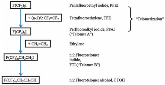 Telomerization was developed in the 1970s and is the most used procedure nowadays. It involves a two-step method. In the first step, a perfluoroalkyl iodide (CmF2m+1I, PFAI) reacts with tetrafluoroethylene (CF2=CF2, TFE), yielding a longer-chain perfluoroalkyl mixture, CmF2m+1(CF2CF2)nI, which constitutes Telomere A. In the second step, ethylene is added to this mixture to form CmF2m+1(CF2CF2)nCH2CH2I, Telomere B. The two telomeres A and B are intermediate raw materials and are used for the construction of more building blocks, which then react further, producing a variety of surfactants and polymers, based on fluorotelomers []. The process is shown in Figure 5.