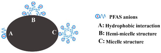 The hydrophobic interactions (Figure 7) are due to the interaction of the hydrophobic fluoroalkyl chains with hydrophobic sites on the surface of the adsorbent. Exceeding the critical micelle concentration (cmc) can result in the formation of multilayered structures, including micelles and hemicells, which can affect adsorption. However, at the environmental level, PFAS micelle formation is rare, and only aggregates have been observed. The PFAS adsorption process may present two distinct phases, i.e., initially, removal occurs via PFAS adsorption on open adsorbent sites, but due to the gradual blocking of pore sites, removal converts to a function of molecular aggregation [,].