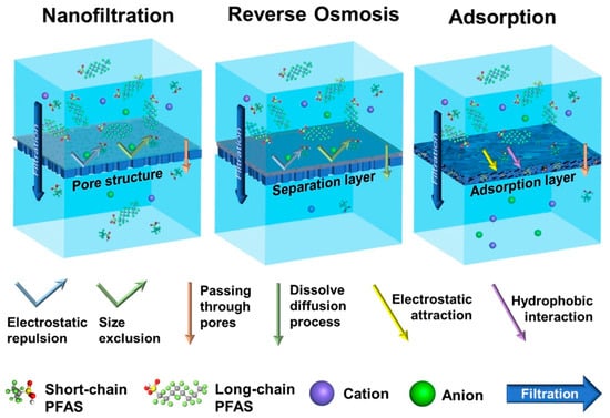 Nanofiltration (NF) is a membrane technique based on pressure that involves membranes with a pore size between 1 and 10 nm, which is smaller than that of PFAS molecules. Typically, they comprise negatively charged and hydrophilic surfaces along with a rather low molecular weight cut-off (MWCO). Reverse osmosis (RO) is a process in which the transfer of water through the semi-permeable membrane occurs due to compression, increasing the pressure of the feed water above its equilibrium point, or osmotic pressure. When the RO membrane feed solution is subjected to such a higher pressure, the water will infiltrate the pores of the membrane, while 95–99% of the molecules bigger than the membrane pores will be blocked, creating a concentration difference on the feed solution side, which is known as brine or brine rejection. The pore size of reverse osmosis membranes is less than 1 nm, while the size of PFAS molecules is significantly bigger. The removal of long-chain PFAS for NF is estimated to be around 85–99%, while for short-chain PFAS, the removal rate is lower, in the range of 20–70%. RO, in general, is more effective in treating both long- and short-chain PFAS. RO membranes generally have a denser structure than NF membranes, which makes RO more effective in removal techniques. The main pathways to remove PFAS from NF and RO membranes are steric (size) exclusion, solution diffusion, and electrostatic interaction. Electrostatic interaction is the dominant mechanism for the treatment of short-chain PFAS, while the effect of size exclusion is not efficient when dealing with membranes possessing a similar or greater MWCO []. The different mechanisms of nanofiltration, reverse osmosis, and adsorption are shown in Figure 8.