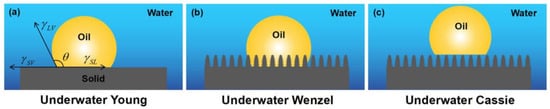 Similar to a droplet in contact with a solid surface in the air, wetting occurs when oil comes into contact with solid underwater surfaces. Therefore, the Young, Wenzel, and Cassie–Baxter states can also be used to describe the wetting behaviors of an underwater oil droplet on solid surfaces (Figure 2).
