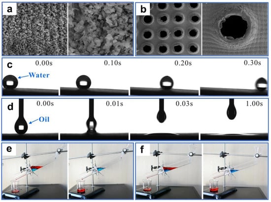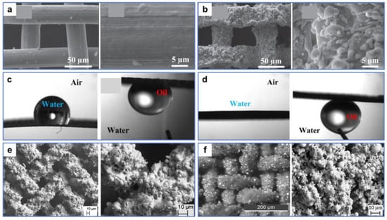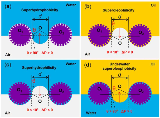 where γ is the surface tension of the liquid; R, l and A are the radius, perimeter, and cross-sectional area of the pore, respectively; θ is the contact angle of the droplet. For superoleophilic/superhydrophobic oil–water separation materials, the contact angle of oil (θo) is <10° and the contact angle of water (θw) is >150°, resulting in the intrusion pressure of oil being (ΔPo) < 0 and the intrusion pressure of water being (ΔPw) > 0 (Figure 3a,b). Therefore, when heavy oil–water mixtures come into contact with superoleophilic/superhydrophobic surfaces, the heavy oil can easily pass through the surfaces, while the water cannot. For superhydrophilic/superoleophobic oil–water separation materials, the contact angle of water (θw) is <10° and the underwater contact angle of oil (θo) is >150°, resulting in the intrusion pressure of water being (ΔPw) < 0 and the intrusion pressure of underwater oil being (ΔPo) > 0 (Figure 3c,d). Therefore, when light oil–water mixtures come into contact with the superhydrophilic/superoleophobic surfaces, the water can freely pass through the surfaces quickly, while the light oil is fully blocked.