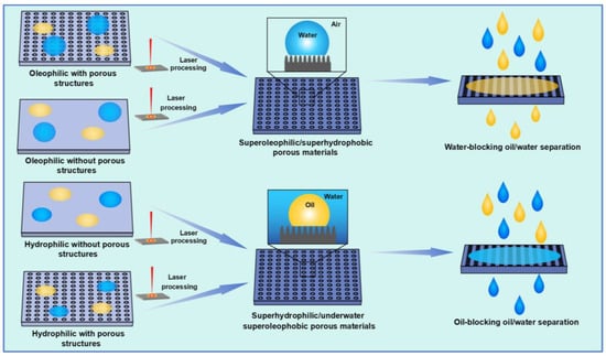 Figure 5 summarizes the design strategy of laser-fabricated superwetting porous materials for oil–water separation. Generally, the hydrophobic materials are transformed from hydrophobic/oleophilic to superhydrophobic/superoleophilic by laser-fabricating mico–nano structures on the surface, thus realizing water-blocking oil–water separation. In addition, the pores required for oil passage can also be fabricated by ultrafast lasers. Similarly, the superhydrophilic/underwater superoleophobic porous materials for oil-blocking oil–water separation can be fabricated from hydrophilic materials based on ultrafast laser processing.