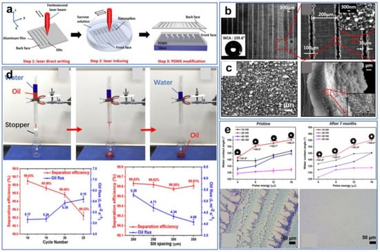 Furthermore, ultrafast laser processing can be combined with other surface-modification methods to prepare superhydrophobic and superoleophilic materials. In this case, laser ablation provides a certain surface roughness, while modification imparts opposite wettability to the surface. For instance, Ma et al. [111] fabricated a superhydrophobic and superoleophilic aluminum membrane by combining laser processing and PDMS modification (Figure 8a). First, the parallel narrow slit arrays were neatly fabricated on one side of the Al film along the x-axis direction through ultrafast laser processing, with a laser energy density higher than the threshold (Figure 8b). Subsequently, the Al film was immersed in a sucrose solution at a depth of 10 mm, while the other side of the Al film was processed along the y-axis direction (Figure 8c). After laser processing, numerous nanospikes were created on the front face of the Al film. Finally, using a muffle furnace, the thin PDMS liquid layer that was spin-coated on the glass substrate was evaporated onto the front side of the Al film. The as-prepared Al film exhibited superhydrophobic/superoleophilic properties and excellent separation efficiency (Figure 8d). In addition, the Al film with excellent stability maintained good superhydrophobicity after 7 months of exposure to air (Figure 8e).