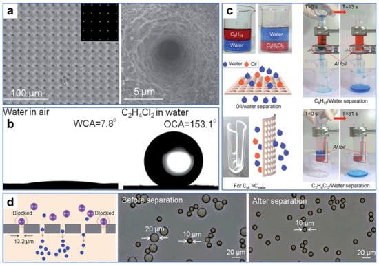 Additionally, the pores of materials designed for oil–water separation can be directly manufactured by ultrafast laser. For instance, Li et al. [116] fabricated ultrathin Al foil with large-area regular micropore arrays by one-step laser processing. Leveraging high precision and controllability, the uniform arrays of micropores with rough nanostructures were neatly arranged on the surface of the aluminum foil by a femtosecond laser (Figure 10a). The multi-stage composite structures provided by micro-sized pores and nanoscale roughness greatly changed the wettability of the aluminum foil from hydrophilic to superhydrophilic and underwater superoleophobic (Figure 10b). By employing a small oil–water separator, substantial quantities of light and heavy oil–water mixtures could be easily and quickly separated and purified, offering the potential for recovering oil and water (Figure 10c). In addition, the micropore-arrayed aluminum foil can efficiently filter particles of different sizes (Figure 10d), demonstrating versatile application properties. The as-prepared controllable aluminum foils with high precision and efficiency provide an alternative for building a lab-on-a-chip and even separating blood and cells.