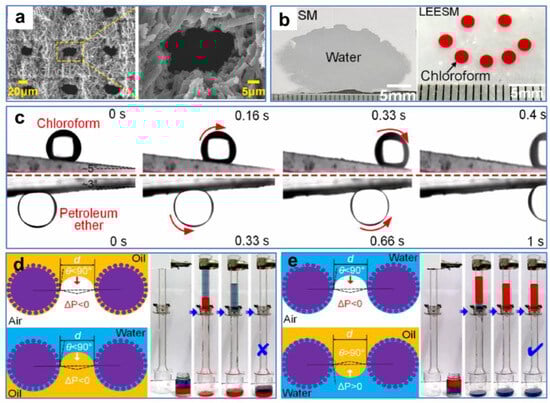 (a) SEM images of the as-prepared membranes. (b) Wettability of the as-prepared membranes. (c) Time-lapsed snapshots of chloroform and petroleum ether droplets rolling off the tilted samples in water. (d) Oil–water separation test with oil pre-wetting. (e) Oil–water separation test with water pre-wetting. Reproduced from ref. [120] with permission from Elsevier (copyright 2022).