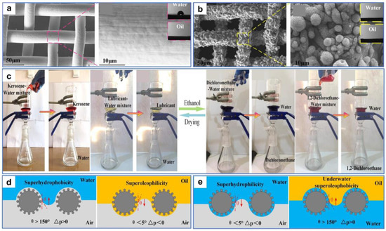 (a) SEM images of the original stainless-steel mesh. (b) SEM images of the processed stainless-steel mesh. (c) Digital images of the separation process of light oil–water mixtures (left) and heavy oil–water mixtures (right). (d,e) Schematic of the oil–water mixtures’ separation mechanism. Reproduced from ref. [121] with permission from American Chemical Society (copyright 2020).