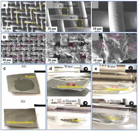 While the oil–water separation materials with reversible superwettability can be obtained via treatments, such as ethanol immersion, atmospheric pressure plasma jet [122], etc., these methods may entail additional expense or complex conversion operations in practical applications. Therefore, superamphiphilic membranes with superhydrophilic and superoleophilic properties may have a wider range of practical applications. For example, Wang et al. [123] fabricated a robust microstructure on 304 stainless-steel mesh using waterjet-assisted laser ablation. The as-prepared mesh showed excellent separation performances for light and heavy oil–water mixtures and corrosion solutions–oil mixtures. As shown in Figure 13a, the surface of the original stainless-steel mesh without microstructures and micropores is relatively smooth. After treatment, abundant micron-sized sandy textures and micropores were created on the mesh surface, and the pore size was reduced (Figure 13b). These micro–nano structures played a crucial part in the superwettability of the mesh surface. Water and oil droplets diffused rapidly upon contacting the sample surface, indicating the superhydrophilic and superoleophilic properties of the processed surface (Figure 13c). In liquid environments, the wettability of the mesh changed from underwater oleophobic and underoil superhydrophobic to underwater superoleophobic and underoil superhydrophobic after processing (Figure 13d,e). The as-prepared stainless-steel mesh could achieve the separation for light and heavy oil–water mixtures only by water prewetting and oil prewetting. When the as-prepared mesh was prewetted by water, the water could pass quickly through the mesh, while the light oil could not. In contrast, when the mesh was prewetted by oil, the heavy oil could pass quickly through the mesh, while the water could not.