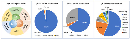 (a) Consumption fields of Ga, In, and Ge in global and (b,c) global refinery production distribution; (b) Ga; (c) Ge; and (d) In. (data from USGS, 2021).