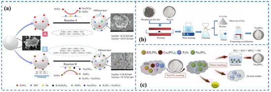 Ultrasonic waves can quickly disperse solids and speed up the reaction. For the treatment of corundum dust, ultrasonic wave technology is used to assist H2SO4 leaching, as shown in Figure 3a [4]. Under optimum conditions, the leaching rate of Ga increased from 62.78% to 82.56%. The Na2CO3 calcination–water leaching is used to enrich Ga from phosphate dust, and the specific process is shown in Figure 3b,c [23]. At high temperatures, Na2CO3 reacts with phosphate rock powder to encapsulate Ga in sintered minerals. This method can effectively enrich Ga and is simple to operate.