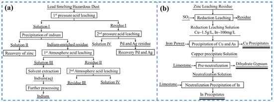 (a) Flowchart of selective recovery of indium from LSHD (Zhang et al. [31]) and (b) from zinc leaching residue (Deng et al. [64]).
