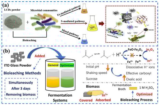 In recent years, researchers have attempted to carry out the bioleaching of indium from waste LCDs, such as sulfur-oxidizing bacteria [66], acidophilic iron-oxidizing bacteria [67], Aspergillus niger fermentation broth [68], Eleocharis acacularis [69], etc. In addition, different bioleaching approaches (as shown in Figure 7a) have an impact on the leaching efficiency of indium [70]. Thiobacillus acidophilus thiooxidans could completely develop indium leachate from waste LCDs under S-mediated conditions. Cui et al. [71] optimized the fermentation system of Aspergillus niger and elucidated its bioleaching mechanism (as shown in Figure 7b). The fermentation broth of Aspergillus niger can secrete organic acids and proteins and release a large amount of H+. H+ can react with indium-containing substances in waste LCDs.