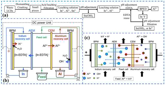 (a) Schematic diagram of the process of BPED separation of In and Al, (b) schematic diagram of electrodialysis device, and (c) mechanism diagram (Takemura, Y et al. [73]).