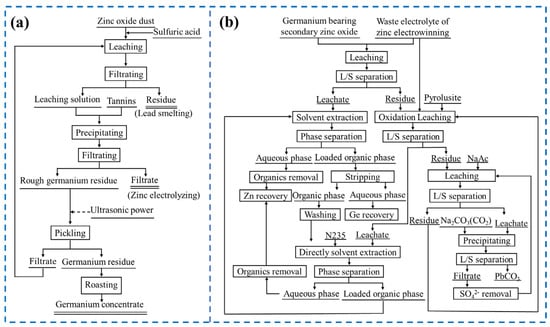 Flowchart of recycling Ge from (a) purifying germanium−tannin residue (Di et al. [35]) and (b) secondary zinc oxide (Jiang et al. [3]).