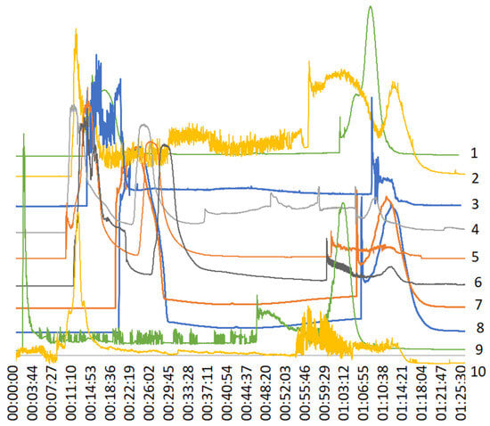 Later, ten CPC analyses were performed using the selected solvent system with different flow rates, rotation speeds, and injection volume settings according to the parameters presented in Table 1 to find the best settings and achieve a recovery of the least studied molecule, magnoflorine. Figure 1 shows the obtained CPC chromatograms.