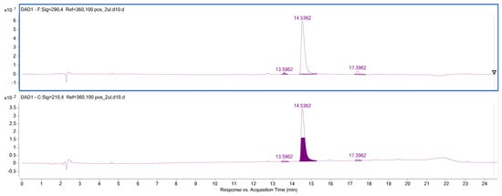 As a result of the herein-described studies on a CPC chromatograph, high-purity MGN (95.1%) and berberine (91.2%) were obtained. The most advantageous separations were recorded for injection 6 (see Figure 1) from the root extract and 10 for the fractionation of the stem. The chromatograms of the fractions containing MGN are presented in Figure 2 below, whereas the chromatograms of the extracts and berberine are presented in the Supplementary Materials (Figures S1 and S2).