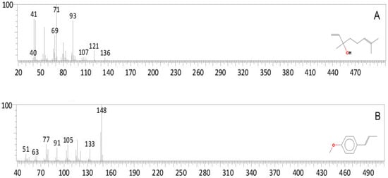Mass spectrum of the two major compounds of O. basilicum: (A) linalool and (B) anethole.