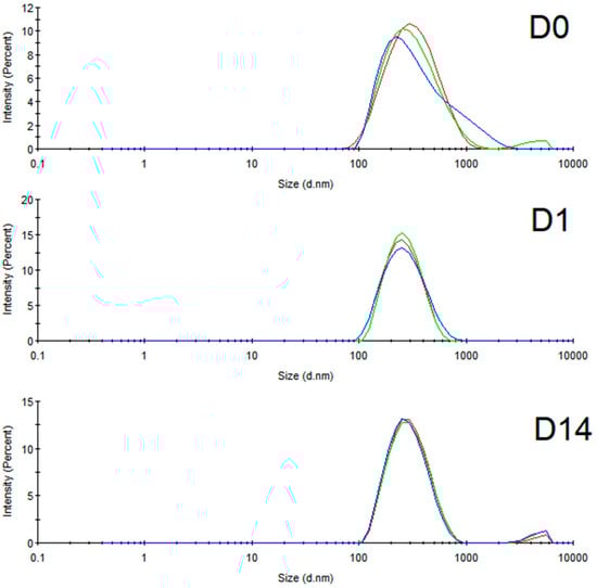Droplet size distribution of the nanoemulsion prepared with O. basilicum and polysorbate 20. Mean droplet size: Day D0: 278.3 ± 1.102 nm; Day D1: 244.6 ± 3.102 nm; Day D14: 280.4 ± 2.957 nm. Polydispersity index: Day D0: 0.231 ± 0.021; Day D1: 0.152 ± 0.022; Day D7: 0.209 ± 0.015.