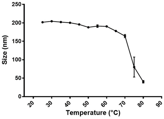 We can analyze the influence of temperature on the size of the nanoemulsion droplets, as shown in Figure 3. There was a slight decrease in the size of the nanoemulsion in the increase in temperatures in a range of 25–50 °C; from this temperature to 60 °C, the size was maintained. After this temperature, it tended to decrease, with a notable reduction in the average size after 70 °C, reaching a minimum value at the end of the analysis, confirming the correlation between the temperature and the size of the nanoemulsions [42,43].
