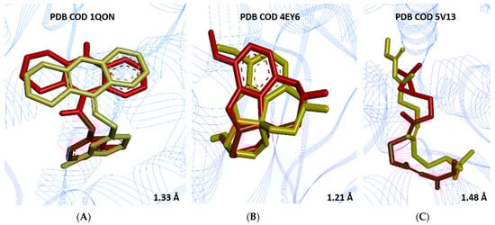 The validation of the ligand’s molecular fit was performed by comparing the position of the crystallographic inhibitor and the position obtained for the same inhibitors (PDB ID structures: 1QON, 4EY6, and 5V13), based on the RMSD value (Table 1).