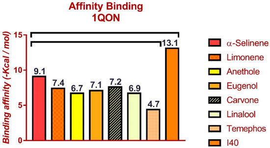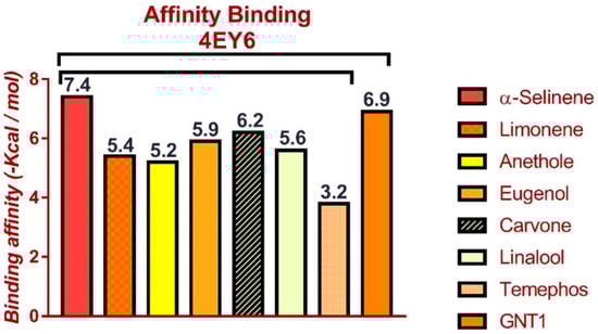 The parameters evaluated in this methodological step were neuromuscular blockers of acetylcholine, acetyl-esterase inhibitors, insecticidal activity, and juvenile hormone esterase. When we checked the aspects of the neuromuscular blocker of acetylcholine, comparing it with the positive control, temephos, it is possible to verify that the anethole, carvone, α-Selinene, eugenol, and limonene presented values superior to the positive control, except the compound Linanool [27,33], one of the main compounds of the species.