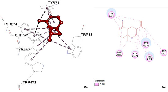 According to Harel (2000) [61] and Costa (2019) [24], for the enzyme acetylcholinesterase of the fruit fly insect (D. melanogaster), inhibition was observed when binding with I40 (reference ligand). It showed interactions at the active site of the macromolecule mainly in amino acid residues Trp-83 and Trp-472, Phe-330, Tyr-71, Tyr-370 and Tyr-374, Tyr-324, and Phe-371. The interactions of the alpha-Selinene compound, which demonstrates the interactions of the best result of the binding affinity, confirms that this compound performed interactions with many amino acids of the macromolecule (PDB 1QON), which were Tyr-71, Tyr-370, Phe-374, Trp-83, and Trp-472, showing a possible inhibitor of the insect’s acetylcholinesterase enzyme (Figure 8).