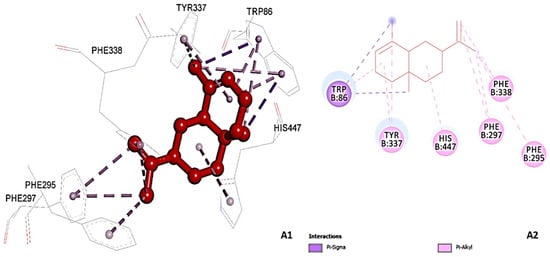 The active site of human AChE contains a catalytic triad of amino acid residues: Ser-203, His-447, and Glu-334; other critical regions for inhibiting the enzyme are Gly-121, Gly-122, Ala-204, Trp-86, Trp-9, Trp-10, and Glu-202 [24,62,63,64]. When we analyzed the interactions in the enzyme acetylcholinesterase in humans, only α-selinene interacted with two amino acid residues (Tpr-86 and His-447) that are in distant positions in the amino acid chain, making it a compound with little activity on the enzyme in humans (Figure 9).