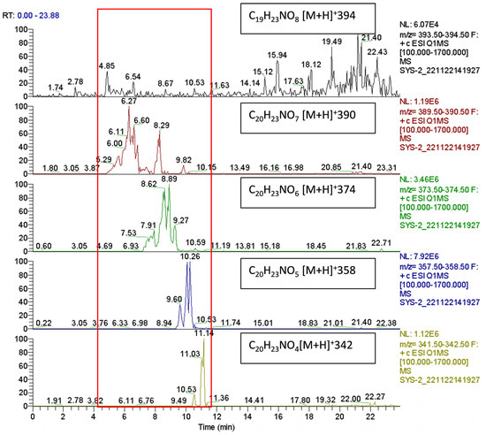 These various kinkeloids and isomers were identified by ion extraction of their molecular formulae (molecules of interest). Figure 1 shows the extraction protonated molecular ion chromatograms of compounds of target mass 390 u between 7.5 and 10.5 min, compounds of mass 374 u between 8.5 and 11 min, compounds of mass 358 u between 10.2 and 12.8 min (as well as a small peak at 3 min), and compounds of mass 342 u between 11.9 and 14 min (as well as a small peak at 3 min). No peak was observed at mass 394 u.