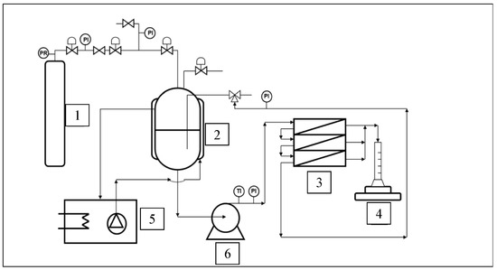 Flow diagram of the Triple System Model F1 membrane module designed by Hidalgo et al. [19]: (1) nitrogen bottle (outer cage); (2) feed tank; (3) membrane Triple System Model F1; (4) digital scale; (5) thermostat; (6) pressure pump.