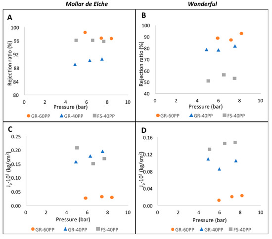 Comparison of selectivity and efficiency, using the rejection coefficient and permeate flux versus pressure, respectively, for Mollar (A,C) and Wonderful (B,D) varieties.