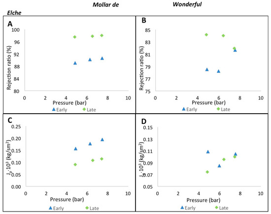 Selectivity and efficiency comparison using the rejection coefficient and permeate flux versus pressure, respectively, for Mollar (A,C) and Wonderful (B,D) varieties at the early and late maturity stage.