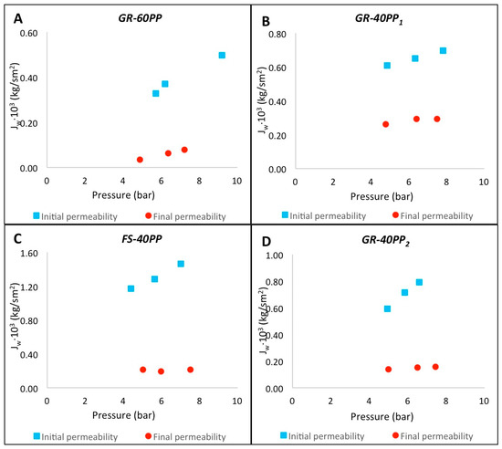 In Figure 2A,C, it is observed that, for the Mollar variety, high rejection coefficients (88 and 96% for GR-40PP and FS-40PP membranes, respectively) and high permeate fluxes (around 0.17 and 0.195 10−3 kg/sm2 for FS-40PP and GR-40PP membranes, respectively) were obtained. However, when studying the pomegranate juice of the Wonderful variety (Figure 2B,D), the rejection coefficient was higher for the GR-40PP membrane and the permeate flux was higher for the FS-40PP, but both parameters were lower in this variety.