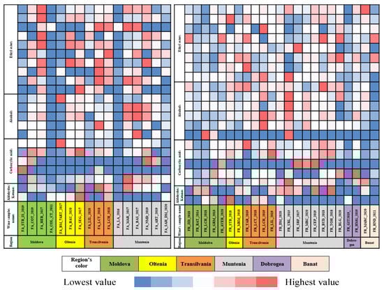 - Avram, V.; Floare, C.G.; Hosu, A.; Cimpoiu, C.; Măruţoiu, C.; Moldovan, Z. Characterization of Romanian Wines by Gas Chromatography–Mass Spectrometry. Anal. Lett. 2015, 48, 1099–1116. [Google Scholar] [CrossRef]