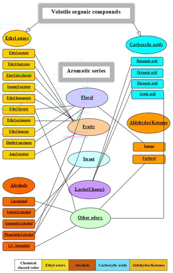 | 1. | Ethyl esters | Ethyl acetate | Aromatic, Brandy, Grape [30] | 5 ppb to 5 ppm [31] |