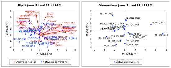 - Rossi, L.; Foschi, M.; Biancolillo, A.; Maggi, M.A.; D’Archivio, A.A. Optimization of HS-SPME-GC/MS Analysis of Wine Volatiles Supported by Chemometrics for the Aroma Profiling of Trebbiano d’Abruzzo and Pecorino White Wines Produced in Abruzzo (Italy). Molecules 2023, 28, 1534. [Google Scholar] [CrossRef] [PubMed]
