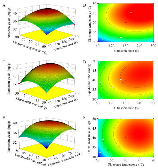 Response surface plots (A,C,E) and contour plots (B,D,F) of variable parameters, including ultrasonic time (X1), ultrasonic temperature (X2), and liquid–solid ratio (X3), on the extraction yields of flavonoids in FTB.