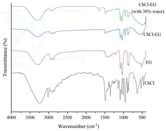 In order to understand the hydrogen bond interactions between ChCl and EG, an FT-IR spectrum experiment was conducted, and the results are shown in Figure 4. In the IR spectrum of ChCl, the stretching vibration peak at 3249 cm−1 was assigned to the -OH stretching, and the sharp peaks at 3019 cm−1 belonged to the stretching vibration peak of -CH [39]. Meanwhile, a vibration band of the alkyl group was presented at 1485 cm−1, which showed the characteristic of ChCl [44]. In the IR spectrum of EG, the broad 3400–3200 cm−1 belonged to the stretching vibration peak of -OH, the peaks at 2938 cm−1 and 2874 cm−1 belonged to stretching vibration of -CH2, the peaks from 1600 to 1200 cm−1 assigned to the -CH2- flexural vibration, and peaks around 1050 cm−1 belonged to stretching vibration of -C-O-. In the IR spectrum of ChCl-EG, the -OH stretching frequency shifted to a higher frequency of 3300 cm−1 compared with ChCl (3249 cm−1) and EG (3289 cm−1), which indicated that ChCl and EG formed new intermolecular hydrogen bonds as a result of intramolecular associations among the components [16]. Meanwhile, by comparing the shifting of the -OH functional groups in ChCl, EG, and pure ChCl-EG, it can be noticed that the band between 3000 and 3600 cm−1 in ChCl-EG had a tendency to be broader and wider, which also indicated the formation of hydrogen bonds during the preparation of the ChCl-EG [44]. From the spectroscopy data, it can also be inferred that the main characteristic functional groups of the monomeric compounds still coexisted after the formation of ChCl-EG, which was consistent with the conclusion of Zhang et al. and Hayyan et al. [11,45]. Finally, compared with ChCl-EG, the spectrum of ChCl-EG with 30% water showed little change, indicating that the addition of water did not disrupt the hydrogen bonding between ChCl and EG.