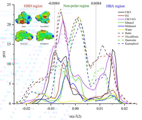 Generally, σ-profiles have the capacity to accurately depict the authentic charge distribution and polarity of molecules, as well as to delineate the overall polarization of a molecular surface. These profiles are highly specific to individual molecules, offering a comprehensive portrayal of their unique characteristics. The σ-profile is typically segmented into three distinct regions: The hydrogen bond acceptor (HBA) region (σ > 0.0084 e/Å2), the hydrogen bond donor (HBD) region (σ < −0.0084 e/Å2), and the non-polar region (−0.0084 e/Å2 < σ < 0.0084 e/Å2) [50]. For extraction, if the target compound and solvent have complementary σ-profiles, they are more likely to exhibit high solubility and extractability [49,51]. Based on the discussion of the σ-profile in Figure 5, the four target flavonoid compounds (rutin, quercetin, kaempferol, and nicotiflorin) in this study are all inclined to be HBAs in the solution; thus, these will have more affinity for the solvent that showed HBD ability when doing the extraction.