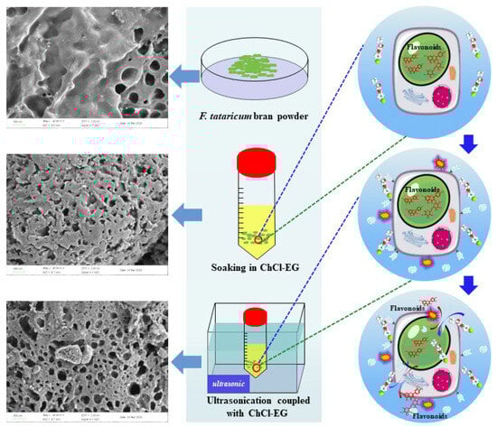Fagopyrum tararicum (tartary buckwheat) is an ancient dicotyledonous cultivated crop that originated in China and has been extensively planted in various countries, including China, India, Japan, Russia, and Korea [1]. F. tararicum is widely recognized as a nutritious and healthful food material, owing to its rich content of various physiologically active substances such as phytosterols, vitamins, carotenoids, fagopyritol, and flavonoids that are beneficial to health [2]. Notably, the flavonoids present in F. tararicum have garnered significant research attention in recent years owing to their abundant presence, unique composition, and remarkable bioactivities [3,4,5]. Numerous reports have demonstrated that the flavonoid compound content in F. tararicum bran (FTB) exceeds that of other milling fractions [5,6]. However, during the milling process of buckwheat grains, the flour is only used for food applications. The bran is usually discarded directly or used as animal feed, which fails to fully utilize the potential of this valuable resource. Thus, to minimize waste and increase the utilization rate of this underdeveloped material, it is essential to develop an efficient method for extracting flavonoid compounds from FTB.