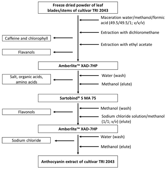 The freeze-dried tea samples were first separated into leaf blades and stems and then ground using a laboratory mill (IKA-Werke, Staufen im Breisgau, Germany). For the powdered leaf blade samples and stem powder, approximately 200 mg was used for the extraction procedure. The samples were macerated in 20 mL of a mixture of water, methanol, and formic acid (49.5/49.5/1; v/v/v) while being stirred at 800 rpm and room temperature for 12 h. For quantitation replicates, 500 µL of a cyanidin-3-O-β-d-glucoside solution with a concentration of 20 mg L−1 was added as an internal standard. The extract was filtered, and the extraction was repeated two more times. Afterwards, the methanol of the combined extracts was removed using a rotary evaporator at 200 mbar and 40 °C. The aqueous solution was then extracted three times using 15 mL of dichloromethane to remove alkaloids, such as caffeine and theobromine, as well as lipids, waxes, and chlorophyll. The aqueous phase was subsequently extracted three times using ethyl acetate to separate most of the flavanols. Prior to submitting the extract to the Amberlite™ XAD-7HP adsorption column (15 mm × 150 mm), the remaining ethyl acetate was removed using a rotary evaporator at 40 °C and 200 mbar. The microporous resin was conditioned using methanol, followed by water. The extract was loaded in and washed with water to remove free sugars, organic acids, and amino acids and eluted with methanol. Since formic and acetic acid cannot be removed easily using a rotary evaporator, no acids were added to the methanol. The solvent was evaporated using a rotary evaporator at 40 °C and 200 mbar. This extract, which still contains flavonols, was further purified using a Sartobind® S MA 75 membrane-modified method according to Juadjur and Winterhalter [18]. The membrane was conditioned with 40 mL McIllvain buffer (pH 3.5) at a flow rate of 10 mL/min. After the membrane was conditioned, the extract, which was solved in 20 mL water containing 0.1% acetic acid, was loaded onto the membrane. The membrane was washed with 60 mL methanol to elute flavonols and other remaining phenols. The elution of anthocyanins was performed using 40 mL of 1 M sodium chloride/methanol (1:1; v/v). After the removal of methanol by rotary evaporator at 40 °C and 200 mbar, the residue was loaded onto an Amberlite™ XAD-7HP resin column to remove the sodium chloride following the method described above with methanol as eluent. Most of the methanol was removed using a rotary evaporator at 200°mbar and 40 °C; the aqueous residue was diluted with water and freeze-dried afterwards. The freeze-dried extract was then dissolved in 1 mL water/acetonitrile/formic acid (95/4/1; v/v/v), filtered through a 0.2 µm PTFE syringe filter, and stored at 4 °C until measured. For quantitation, the extraction was performed in triplicates for the leaf blade and stem powder, with cyanidin-3-O-β-d-glucoside as an internal standard. The extraction procedure for anthocyanins in the cultivar TRI 2043 is summarized in Figure 2.