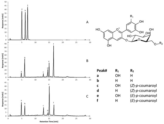 UHPLC chromatogram at 520 nm and structures of the anthocyanin species: (A) mixture of the commercial reference substances with a concentration of 10 mg L−1, (B) the leaf blade extract of cultivar TRI 2043, (C) the stem extract of cultivar TRI 2043. Anthocyanins a-b were identified by comparison with the commercial reference substances, and c-f were tentatively identified by means of literature data [9]. Components: (1) cyanidin-3-O-β-d-glucoside (a) delphinidin-3-O-β-d-galactoside (Del-Gal); (b) cyanidin-3-O-β-d-galactoside (Cy-Gal); (c) delphinidin-3-O-β-d-(6-(Z)-p-coumaroyl)galactopyranoside (Del-Z-Cou-Gal); (d) cyanidin-3-O-β-d-(6-(Z)-p-coumaroyl)galactopyranoside (Cy-Z-Cou-Gal); (e) delphinidin-3-O-β-d-(6-(E)-p-coumaroyl)galactopyranoside (Del-E-Cou-Gal); (f) cyanidin-3-O-β-d-(6-(E)-p-coumaroyl)galactopyranoside (Cy-E-Cou-Gal).