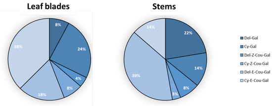 Our analyses have shown that the anthocyanin content in leaf blades is almost two-fold higher compared to the stems of cultivar TRI 2043. Additionally, the distribution of the delphinin and cyanidin species varies between the stems and leaf blades, as shown in Figure 4. Stems exhibited a higher tendency towards delphinidin, with delphinidin derivates representing 69.6% of the total anthocyanins. Conversely, the leaf blades contained more cyanidin derivates, accounting for 69.8% of the total anthocyanin content. The distribution of anthocyanins in the “Sunrouge” green tea cultivar also demonstrates a higher abundance of delphinidin species in all analyzed plant parts, ranging from 71.9% in the first leaf to 88.9% in the stem [13]. On the other hand, the “Zijuan” tea cultivar from China exhibits a distribution that is almost similar to the leaf blades of cultivar TRI 2043, with 39% content of delphinidin and 49% content of cyanidin [9].